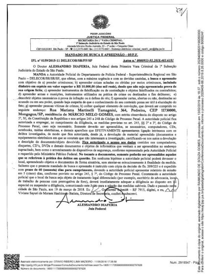 “Assim sendo, DETERMINO, a expedição de mandados de busca e apreensão nas 62 (sessenta e duas) residências constantes da tabela acima, das pessoas para as quais foram aplicadas medidas cautelares de comparecimento mensal e proibição de viagem ao exterior. DETERMINO, igualmente, o mandado de busca e apreensão nas seguintes residências: (Rua Mariana Martinelli Tamagnini, 364, Pedreira, CEP 11739-000, SP, Mongaguá).” (residência: MÁRCIO MELO GOMES) (Decisão em Mandado de Busca e Apreensão e Prisão Temporária da 1ª Vara Federal Criminal, do Júri e das Execuções Penais de São Paulo, Proc. Nº 0000953-93.2018.4.03.6191) (docs. anexo)